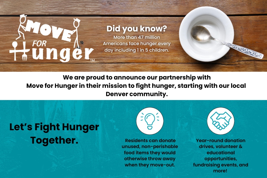 Move for Hunger has created a sustainable solution for the relocation industry to make a positive impact. Since 2009, they have delivered 50 million pounds of food to food banks across the United States and Canada. That’s the equivalent of more than 42 million meals. Through this partnership, we are enabling our residents to make a difference by donating their unopened, non-perishable food items that would otherwise be thrown away during their move-out process. These donations are then picked up by our Move for Hunger crew and are distributed to local food banks in Denver, ensuring that they reach those in need.